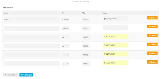 setelah di tambahkan 6 kolom dan jangan lupa ubah 2 kolom teratas dengan type CNAME setelah itu masukan CNAME yang di blog anda seperti di bawah ini