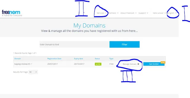 - bagian ke dua klik services nanti di sana akan muncul my domain apabila anda sudah login dan klik my domain tersebut dan tamilannya seperti gambar di atas