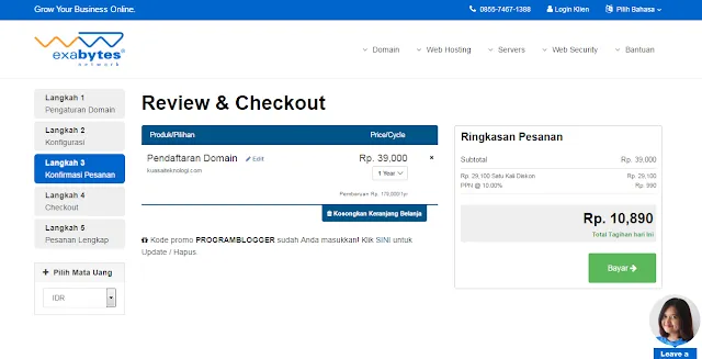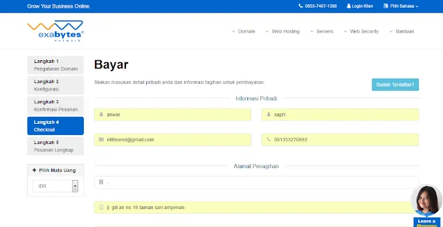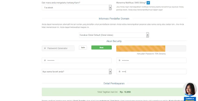 - pada gambar di atas domain .com buat saya masih tersedia kemudian pilih yang massa aktip 1 tahun dan centang setelah di pilih dan di centang kemudian klik lanjjutkan, tampillannya akan seperti berikut: