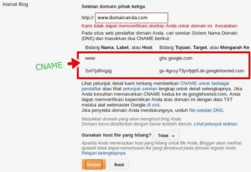 setelah di masukan CNAME itu kemudian masukan alamat IP yang ada pada gambar di atas itu alamat IP dari google, setelah itu klik save change dan tunggu beberapa detik setelah ada pemberitahuan sukses kemudian beralih ke bagian blog anda dan jangan lupa masukan domain gratis yang anda punya dengan menambahkan www di depannya kemudian klik simpan klik simpan dan tunggu beberapa menit setelah perubahan di simpan jangan lupa edit yang di bagian domain dan lupa centang alihkan bajang-review.ml ke www.bajang-review.ml setelah itu klik simpan dan selamat anda berhasil memiliki domain gratis tersebut